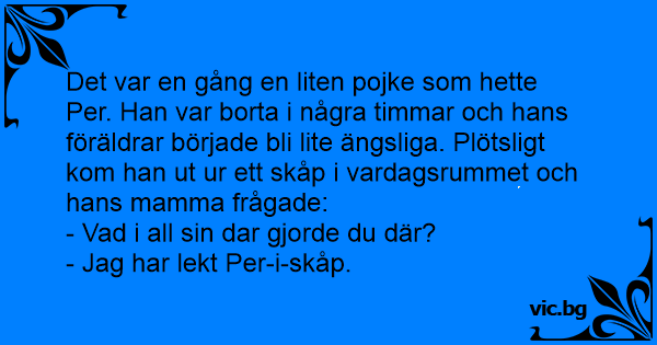 Det var en gång en liten pojke som hette Per. Han var borta i några timmar och hans föräldrar började bli lite ängsliga. Plötsligt kom han ut ur ett skåp i vardagsrummet och hans mamma frågade: