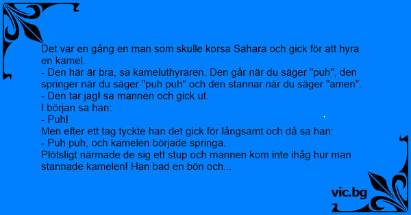 Plötsligt närmade de sig ett stup och mannen kom inte ihåg hur man stannade kamelen! Han bad en bön och avslutade med "amen". Ungefär en centimeter från stupet stannade kamelen och mannen pustade ut och sa: