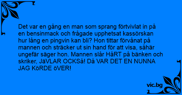 Det var en gång en man som sprang förtvivlat in på en bensinmack och frågade upphetsat kassörskan hur lång en pingvin kan bli? Hon tittar förvånat på mannen och sträcker ut sin hand för att visa, såhär ungefär säger hon. Mannen slår HåRT på bänken och skriker, JäVLАR OCKSå! Då VAR DET EN NUNNA JAG KöRDE öVER!