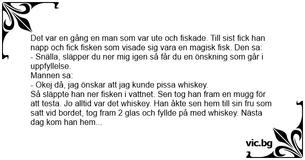 Så släppte han ner fisken i vattnet. Sen tog han fram en mugg för att testa. Jo alltid var det whiskey. Han åkte sen hem till sin fru som satt vid bordet, tog fram 2 glas och fyllde på med whiskey. Nästa dag kom han hem efter jobbet och skulle ta sig en whiskey med frun som vanligt, men den här gången tog han bara fram ett glas. Då sa kärringen:
