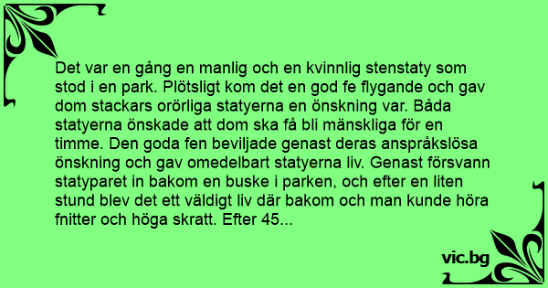 Két szobor áll a parkban. Egyszer csak leszáll hozzájuk a jó tündér és azt mondja nekik: - Itt áltok már 100 éve, fél órára mozoghattok egy kicsit. A két szobor megmozdul és kézenfogva berohannak a...