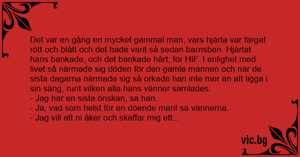 Det var en gång en mycket gammal man, vars hjärta var färgat rött och blått och det hade varit så sedan barnsben. Hjärtat hans bankade, och det bankade hårt, för HIF. I enlighet med livet så närmade sig döden för den gamle mannen och när de sista dagarna närmade sig så orkade han inte mer än att ligga i sin säng, runt vilken alla hans vänner samlades.