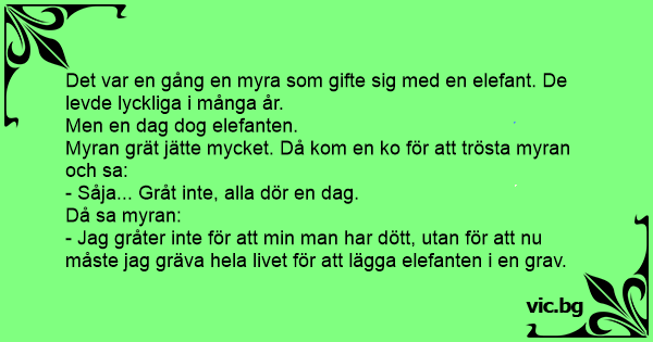 Det var en gång en myra som gifte sig med en elefant. De levde lyckliga i många år.