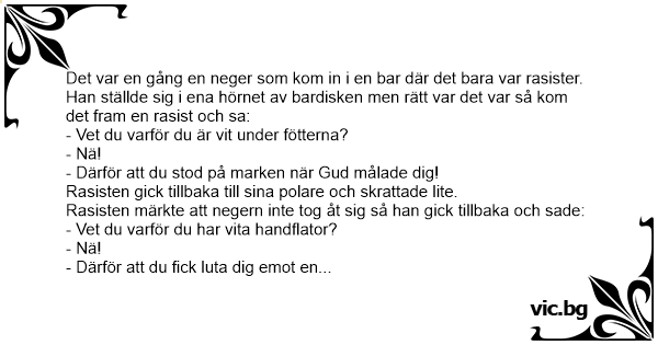 Nu gick rasisten tillbaka till sina polare igen, men rätt vad det var så kom negern fram till rasisten och sa: