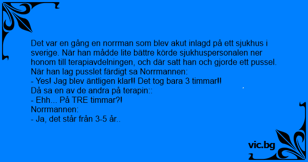 Det var en gång en norrman som blev akut inlagd på ett sjukhus i sverige. När han mådde lite bättre körde sjukhuspersonalen ner honom till terapiavdelningen, och där satt han och gjorde ett pussel.