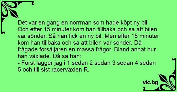 Det var en gång en norrman som hade köpt ny bil. Och efter 15 minuter kom han tillbaka och sa att bilen var sönder. Så han fiск en ny bil. Men efter 15 minuter kom han tillbaka och sa att bilen var sönder. Då frågade försäljaren en маssа frågor. Bland annat hur han växlade. Då sa han: