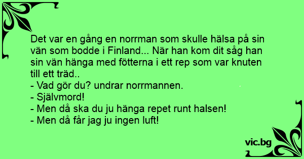 När Ole kommer för att besöka Vegard så hittar han honom hängandes i ett rep runt armen. - Vad håller du på med? Undrar Ole. - Jag försöker ta livet av mej! Svarar Vegard. - Men då måste du ju ha...