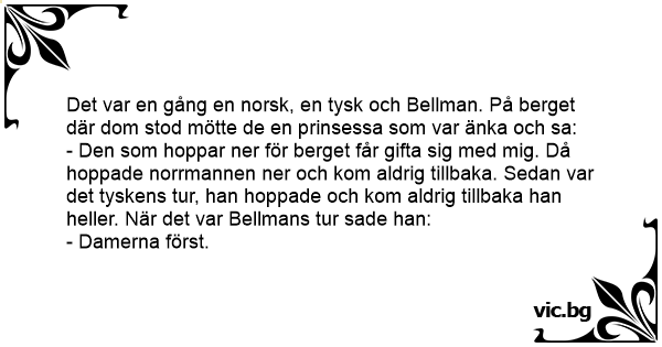 - Den som hoppar ner för berget får gifta sig med mig. Då hoppade norrmannen ner och kom aldrig tillbaka. Sedan var det tyskens tur, han hoppade och kom aldrig tillbaka han heller. När det var Bellmans tur sade han: