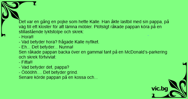 Det var en gång en pojke som hette Kalle. Han åkte lastbil med sin pappa, på väg till ett kloster för att lämna möbler. Plötsligt råkade pappan köra på en stillastående lyktstolpe och skrek: