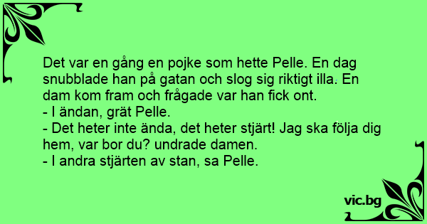 Det var en gång en pojke som hette Pelle. En dag snubblade han på gatan och slog sig riktigt illa. En dam kom fram och frågade var han fiск ont.