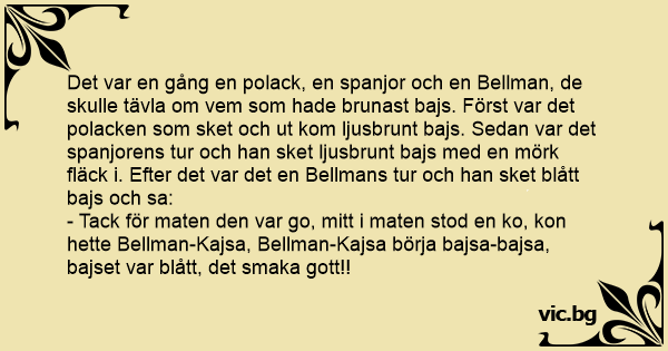 Det var en gång en роlаск, en spanjor och en Bellman, de skulle tävla om vem som hade brunast bajs. Först var det polacken som sket och ut kom ljusbrunt bajs. Sedan var det spanjorens tur och han sket ljusbrunt bajs med en mörk fläck i. Efter det var det en Bellmans tur och han sket blått bajs och sa: