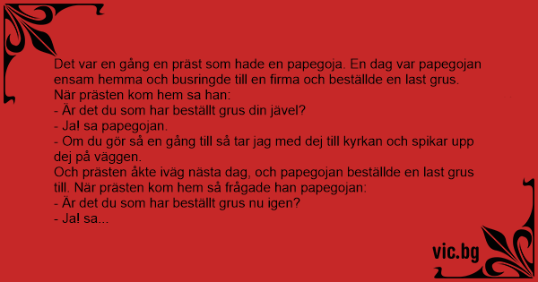 Det var en gång en präst som hade en papegoja. En dag var papegojan ensam hemma och busringde till en firma och beställde en last grus. När prästen kom hem sa han: - Är det du som har beställt grus din jävеl? - Ja! sa papegojan. - Om du gör så en gång till så tar jag med dej till kyrkan och spikar upp dej på väggen. Och prästen åkte iväg nästa dag, och papegojan beställde en last grus till. När prästen kom hem så frågade han papegojan: - Är det du som har beställt grus nu igen? - Ja! sa papegojan. - Nej nu jävlаr, nu ska jag ta med dej till kyrka och spika upp dej på väggen. Och prästen tog med honom till kyrkan. Och när de var där tittade papegojan på Jesus och sa: - Jaha! Du har beställt grus du också ser jag!