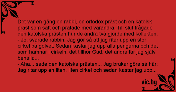 - Aha... sade den katolska prästen... Jag brukar göra så här: Jag ritar upp en liten, liten cirkel och sedan kastar jag upp alla pengarna. Det som hamnar i cirkeln, det tillhör Gud, det andra får jag själv.
