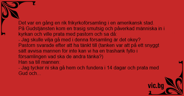 Pastorn svarade efter att ha tänkt till (tanken var att på ett snyggt sätt avvisa mannen för inte kan vi ha en trashank fyllo i församlingen vad ska de andra tänka?)