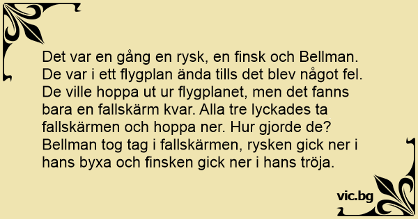 Det var en gång en rysk, en finsk och Bellman. De var i ett flygplan ända tills det blev något fel. De ville hoppa ut ur flygplanet, men det fanns bara en fallskärm kvar. Alla tre lyckades ta fallskärmen och hoppa ner. Hur gjorde de? Bellman tog tag i fallskärmen, rysken gick ner i hans byxa och finsken gick ner i hans tröja.