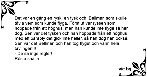 Det var en gång en rysk, en tysk och Bellman som skulle tävla vem som kunde flyga. Först ut var ryssen som hoppade från ett höghus, men han kunde inte flyga så han dog. Sen var det tysken och han hoppade från ett höghus med ett paraply det gick inte heller, så han dog han också. Sen var det Bellman och han tog flyget och vann hela tävlingen!!!
