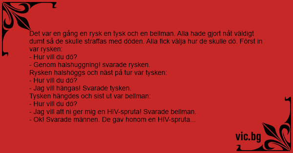 Det var en gång en rysk en tysk och en bellman. Alla hade gjort nåt väldigt dumt så de skulle straffas med döden. Alla fiск välja hur de skulle dö. Först in var rysken: