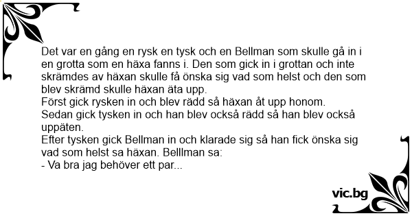 Det var en gång en rysk en tysk och en Bellman som skulle gå in i en grotta som en häxa fanns i. Den som gick in i grottan och inte skrämdes av häxan skulle få önska sig vad som helst och den som blev skrämd skulle häxan äta upp.