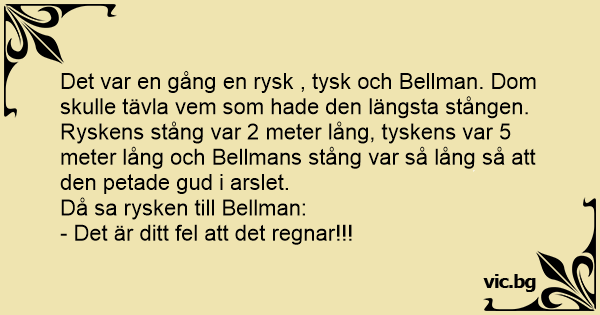 Ryskens stång var 2 meter lång, tyskens var 5 meter lång och Bellmans stång var så lång så att den petade gud i arslet.
