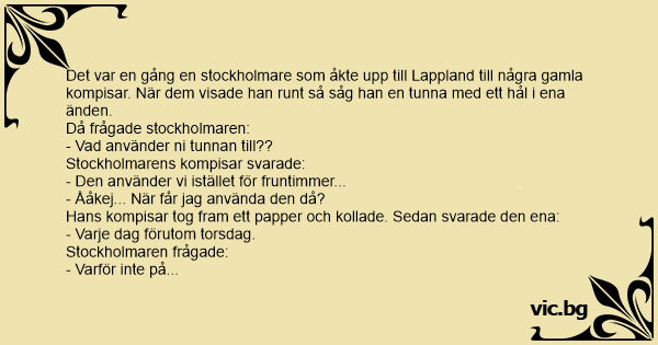 Det var en gång en stockholmare som åkte upp till Lappland till några gamla kompisar. När dem visade han runt så såg han en tunna med ett hål i ena änden.