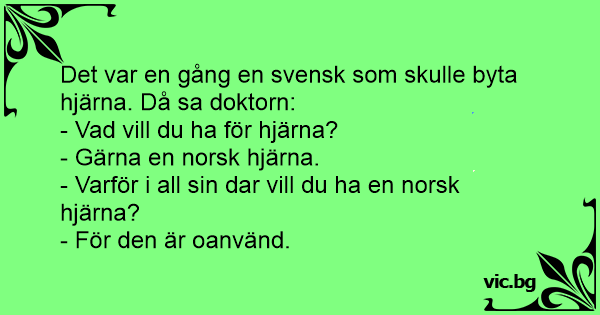 Då det var dags att byta hjärnor sade svensken: - Jag vill ha en norsk hjärna. Punkt slut. - Varför detta? - För den är oanvänd.