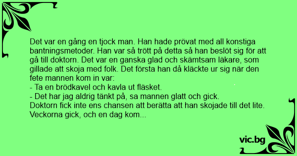 Det var en gång en tjock man. Han hade prövat med all konstiga bantningsmetoder. Han var så trött på detta så han beslöt sig för att gå till doktorn. Det var en ganska glad och skämtsam läkare, som gillade att skoja med folk. Det första han då kläckte ur sig när den fete mannen kom in var: