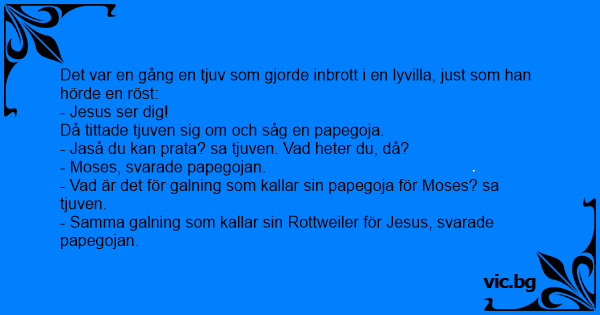 En innbruddstyv brøt seg inn i et hus, og hørte noen si: – Jesus ser deg. Tyven ga fra seg et stønn, og så seg rundt. Og så så han en papegøye i et bur, og så spurte tyven: – Hva heter du? – Moses,...