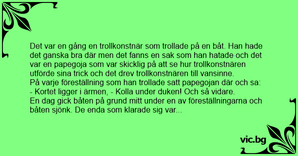 En skicklig trollkarl uppträdde varje kväll på ett kryssningsfartyg. Han hade förmodligen gjort succe om det inte funnits en pratsam papegoja ombord. Varje gång han trollade bort ett kort skrek...