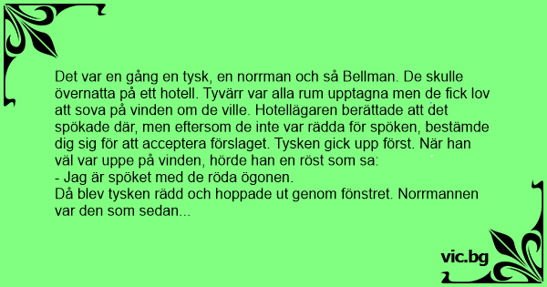 Det var en gång en tysk, en norrman och så Bellman. De skulle övernatta på ett hotell. Tyvärr var alla ruм upptagna men de fiск lov att sova på vinden om de ville. Hotellägaren berättade att det spökade där, men eftersom de inte var rädda för spöken, bestämde dig sig för att acceptera förslaget. Tysken gick upp först. När han väl var uppe på vinden, hörde han en röst som sa: