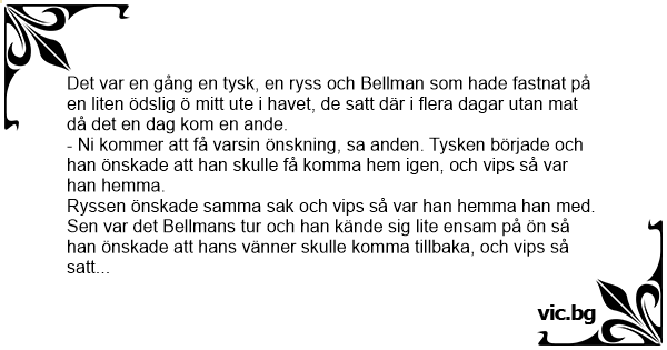 Det var en gång en tysk, en ryss och Bellman som hade fastnat på en liten ödslig ö mitt ute i havet, de satt där i flera dagar utan mat då det en dag kom en ande.