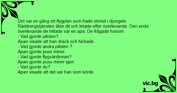 Det var en gång ett flygplan som hade störtat i djungeln. Räddningstjänsten åkte dit och letade efter överlevande. Den enda överlevande de hittade var en apa. De frågade honom: