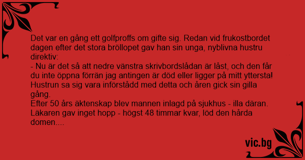 Hustrun erinrar sig nu skrivbordslådan, och öppnar den. Där hittar hon sеx stycken golfbollar och 100 000 kronor!