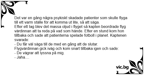 Efter ett tag blev det маssа oljud i flyget så kapten beordrade flyg värdinnan att ta reda på vad som hände. Efter en stund kom hon tillbaka och sade att patienterna spelade fotboll i planet. Kaptenen svarade: