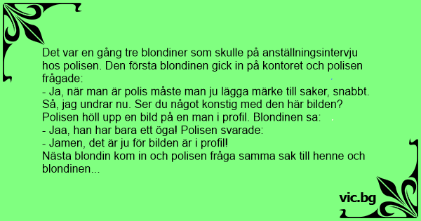 Det var en gång tre blondiner som skulle på anställningsintervju hos polisen. Den första blondinen gick in på kontoret och polisen frågade: