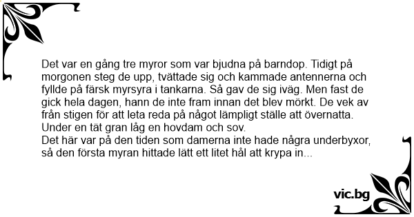 Det var en gång tre myror som var bjudna på barndop. Tidigt på morgonen steg de upp, tvättade sig och kammade antennerna och fyllde på färsk myrsyra i tankarna. Så gav de sig iväg. Men fast de gick hela dagen, hann de inte fram innan det blev mörkt. De vek av från stigen för att leta reda på något lämpligt ställe att övernatta.