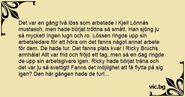 Det var en gång två löss som arbetade i Kjell Lönnås mustasch, men hade börjat tröttna så smått. Han sjöng ju så mycket! Ingen lugn och ro. Lössen ringde upp sin arbetsledare för att höra om det fanns något annat arbete för dem. De hade tur. Det fanns plats kvar i Ricky Bruchs armhåla! Allt var frid och fröjd ett tag, men så en dag ringde de upp sin arbetsgivare igen. Ricky hade börjat träna och det var ju så svettigt! Fanns det möjlighet att få flytta på sig igen? Den här gången hade de tur! Ett riktigt toppjobb var ledigt, i Lill-Babs mus! Tiden gick, men så en dag ringde det hos arbetsledaren igen!! Det var de två lössen. Arbetsledaren sa: