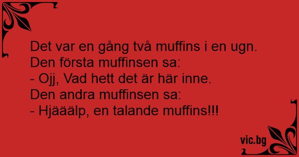 Två muffinsar ligger i en ung. Den ena utbrister: - Fasen va varmt det är här! Den andra förvånat: - Oh!Oj! En talande muffins!