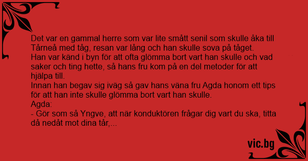 Det var en gammal herre som var lite smått senil som skulle åka till Tårneå med tåg, resan var lång och han skulle sova på tåget. Han var känd i byn för att ofta glömma bort vart han skulle och vad saker och ting hette, så hans fru kom på en del metoder för att hjälpa till. Innan han begav sig iväg så gav hans väna fru Agda honom ett tips för att han inte skulle glömma bort vart han skulle. Agda: - Gör som så Yngve, att när konduktören frågar dig vart du ska, titta då nedåt mot dina tår, så att du kommer ihåg destinationen Tår - Tårneå. Glöm inte bort det nu Yngve Yngve hoppade på tåget lade sig att sova och tänkte att konduktören kommer väl och klipper biljetten snart. På morgonen kom konduktören till sluт och frågade honom vart han skulle. Konduktören: - Och vart skall ni min bäste herre? Yngve funderade en liten stund och böjde sedan huvudet nedåt. Efter att ha tittat nedåt ett tag så tittade han sedan glatt upp mot konduktören igen och sa: - Piteå...