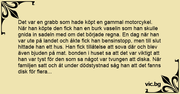 Det var en grabb som hade köpt en gammal motorcykel. När han köpte den fiск han en burk vaselin som han skulle gnida in sadeln med om det började regna. En dag när han var ute på landet och åkte fiск han bensinstopp, men till sluт hittade han ett hus. Han fiск tillåtelse att sova där och blev även bjuden på mat. bonden i huset sa att det var viktigt att han var tyst för den som sa något var tvungen att diska. När familjen satt och åt under dödstystnad såg han att det fanns disk för flera månader framåt så han tänkte att här är dom minsann tysta. Han testade därför genom att våldta bondens dotter, men ingen sa något. Då satte han på frun i huset också, men ingen sa något i alla fall. Precis då så började det att regna så han tog fram vaselin-burken. Då skrek bonden: