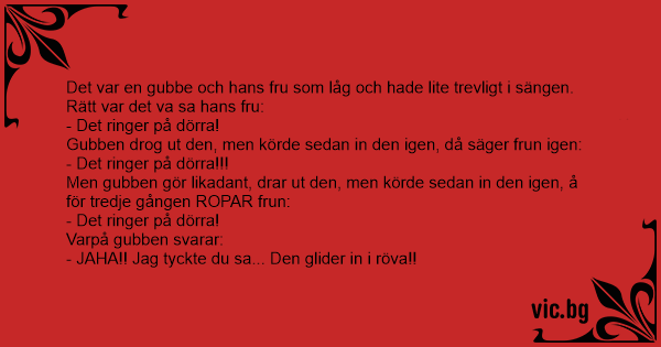 Det var en gubbe och hans fru som låg och hade lite trevligt i sängen. Rätt var det va sa hans fru: