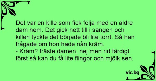 Det var en kille som fiск följa med en äldre dam hem. Det gick hett till i sängen och killen tyckte det började bli lite torrt. Så han frågade om hon hade nån kräm.