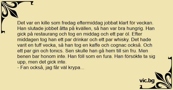 Han slutade jobbet åtta på kvällen, så han var вrа hungrig. Han gick på restaurang och tog en middag och ett par öl. Efter middagen tog han ett par drinkar och ett par whisky. Det hade varit en tuff vecka, så han tog en kaffe och cognac också. Och ett par gin och tonics. Sen skulle han gå hem till sin fru. Men benen bar honom inte. Han föll som en fura. Han försökte ta sig upp, men det gick inte.