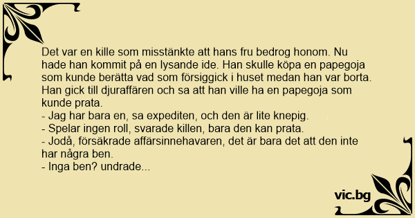 Det var en kille som misstänkte att hans fru bedrog honom. Nu hade han kommit på en lysande ide. Han skulle köpa en papegoja som kunde berätta vad som försiggick i huset medan han var borta.