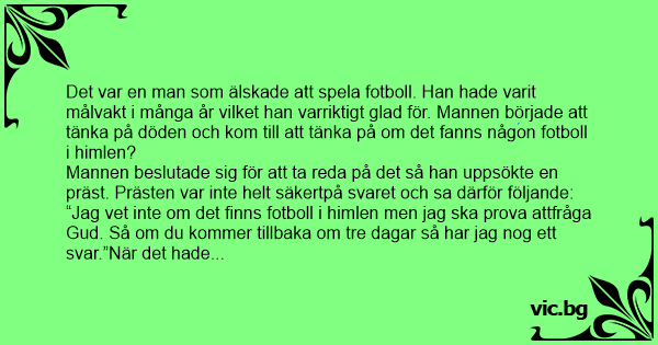 Det var en man som älskade att spela fotboll. Han hade varit målvakt i många år vilket han varriktigt glad för. Mannen började att tänka på döden och kom till att tänka på om det fanns någon fotboll i himlen? Mannen beslutade sig för att ta reda på det så han uppsökte en präst. Prästen var inte helt säkertpå svaret och sa därför följande: “Jag vet inte om det finns fotboll i himlen men jag ska prova attfråga Gud. Så om du kommer tillbaka om tre dagar så har jag nog ett svar.”När det hade gått tre dagar gick mannen nyfiket tillbaka till prästen. - Har du fått svar från Gud? - Ja, det har jag. Jag har både en god och en dålig nyhet. - Okej, låt mig få veta. - Den goda nyheten är att det finns fotboll i himlen. - Det låter вrа, men vad är då den dåliga nyheten? - Du är uttagen till matchen på måndag!