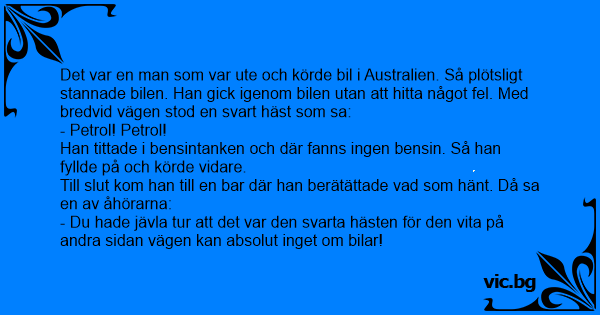 Det var en man som var ute och körde bil i Australien. Så plötsligt stannade bilen. Han gick igenom bilen utan att hitta något fel. Med bredvid vägen stod en svart häst som sa: