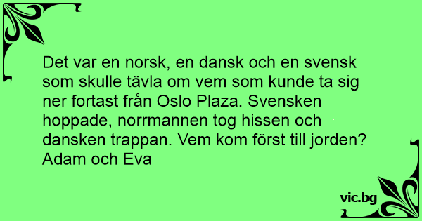 Det var en norsk, en dansk och en svensk som skulle tävla om vem som kunde ta sig ner fortast från Oslo Plaza. Svensken hoppade, norrmannen tog hissen och dansken trappan. Vem kom först till jorden?