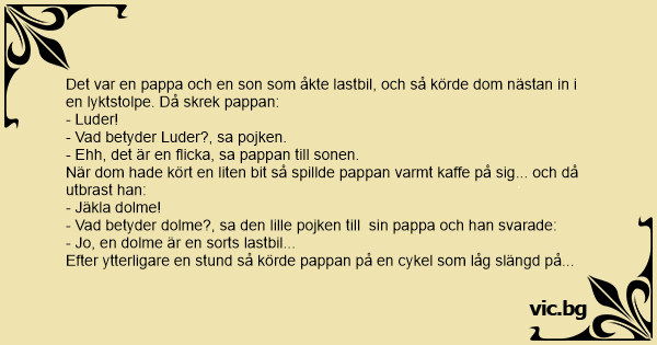 Det var en pappa och en son som åkte lastbil, och så körde dom nästan in i en lyktstolpe. Då skrek pappan: