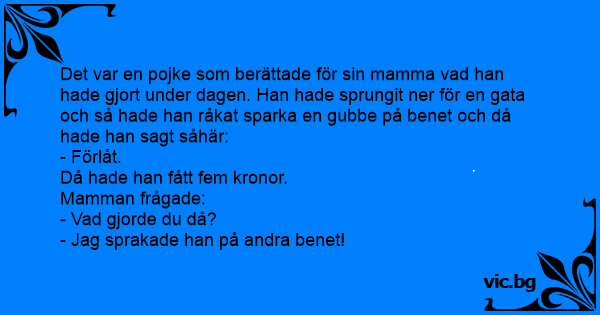 Det var en pojke som berättade för sin mamma vad han hade gjort under dagen. Han hade sprungit ner för en gata och så hade han råkat sparka en gubbe på benet och då hade han sagt såhär: