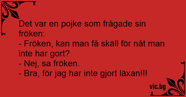 - Fröken kan man få skäll för något man inte har gjort? - Nej, varför undrar du det Pelle? - Jag har inte gjort läxan!