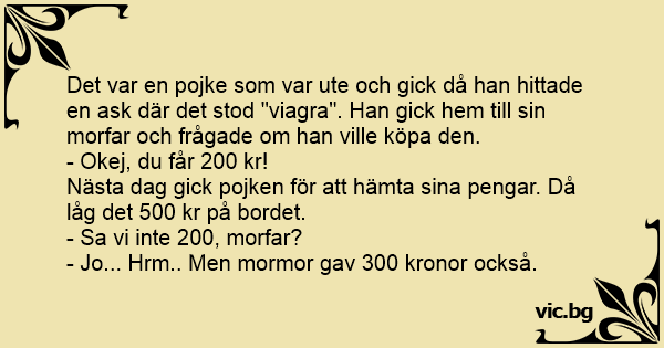 Det var en pojke som var ute och gick då han hittade en ask där det stod "viаgrа". Han gick hem till sin morfar och frågade om han ville köpa den.